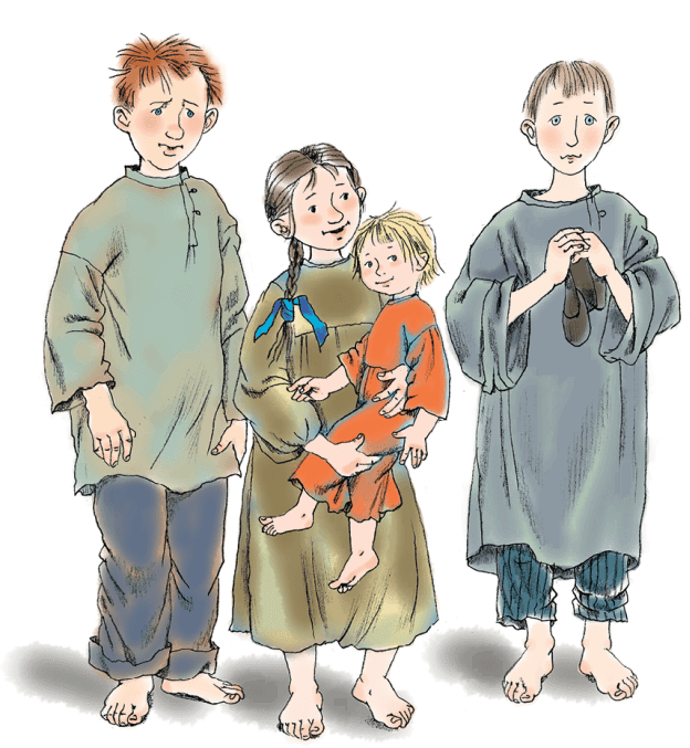 – А как тебя звать? – обращается она ко второму мальчику, в длиннейшей, видно отцовской, рубахе с закатанными рукавами.