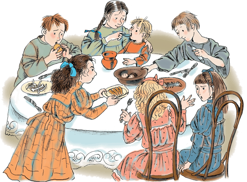 Неожиданные гости – Коля, Антось и Франка со своей сестренкой – быстро садятся за стол.