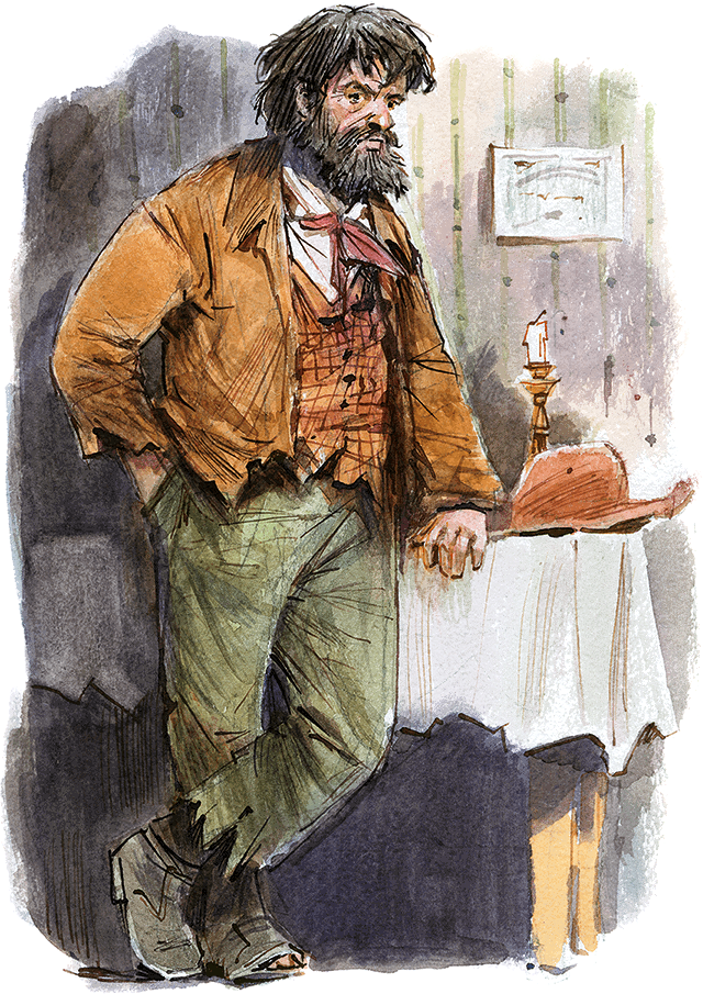 Отцу было лет около пятидесяти, и на вид не меньше того. Волосы у него длинные, нечесаные и грязные, висят космами, и только глаза светятся сквозь них, словно сквозь кусты. Волосы черные, совсем без седины, и длинные свалявшиеся баки, тоже черные. В лице, хоть его почти не видно из-за волос, нет ни кровинки – оно совсем бледное; но не такое бледное, как у других людей, а такое, что смотреть страшно и противно, – как рыбье брюхо или как лягва. А одёжа – сплошная рвань, глядеть не на что. Одну ногу он задрал на колено; сапог на этой ноге лопнул, оттуда торчали два пальца, и он ими пошевеливал время от времени. Шляпа валялась тут же на полу – старая, черная, с широкими полями и провалившимся внутрь верхом, точно кастрюлька с крышкой.