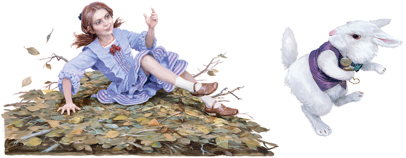 Но и это не показалось Алисе особенно странным. (Вспоминая об этом позже, она подумала, что ей следовало бы удивиться, однако в тот миг все казалось ей вполне естественным.) Но когда Кролик вдруг вынул часы из жилетного кармана и, взглянув на них, помчался дальше, Алиса вскочила на ноги – тут ее осенило: ведь никогда раньше она не видела кролика с часами, да еще с жилетным карманом в придачу! Сгорая от любопытства, она побежала за ним по полю и только-только успела заметить, что он юркнул в нору под зеленой изгородью.
