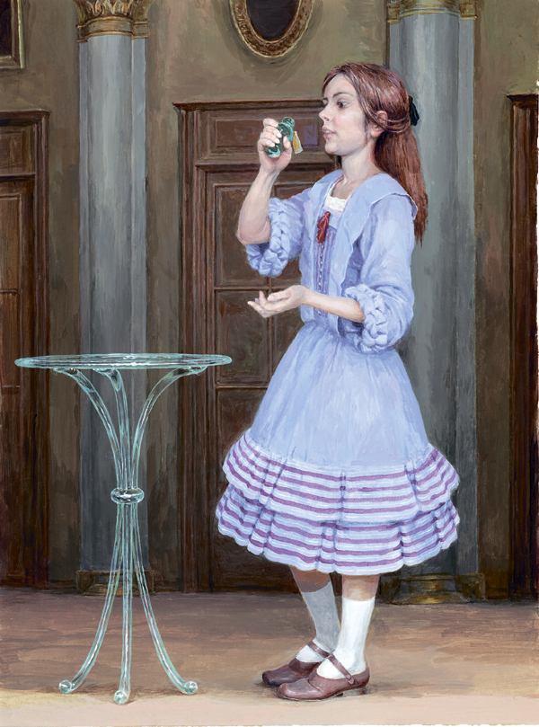 Алиса встала и подошла к столику, чтобы выяснить, какого она теперь роста. Судя по всему, в ней было не больше двух футов, и она продолжала стремительно уменьшаться; вскоре она поняла, что виной тому веер, который она держит в руках, и тут же швырнула его на пол.