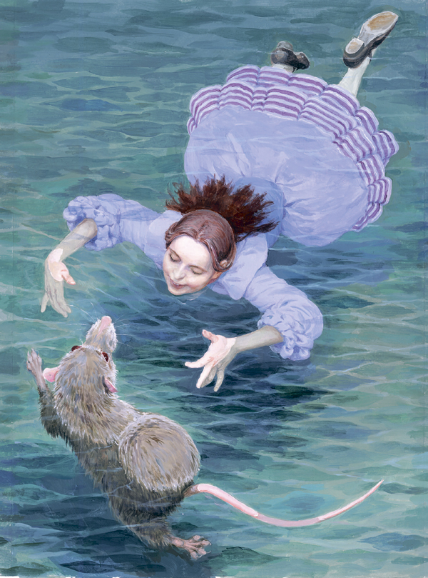 Тут она услышала какой-то плеск неподалеку и поплыла туда, чтобы узнать, кто это там плещется. Сначала она решила, что это морж или гиппопотам, но потом вспомнила, какая она теперь крошка, и, вглядевшись, увидала всего лишь мышь, которая, видно, также упала в воду.