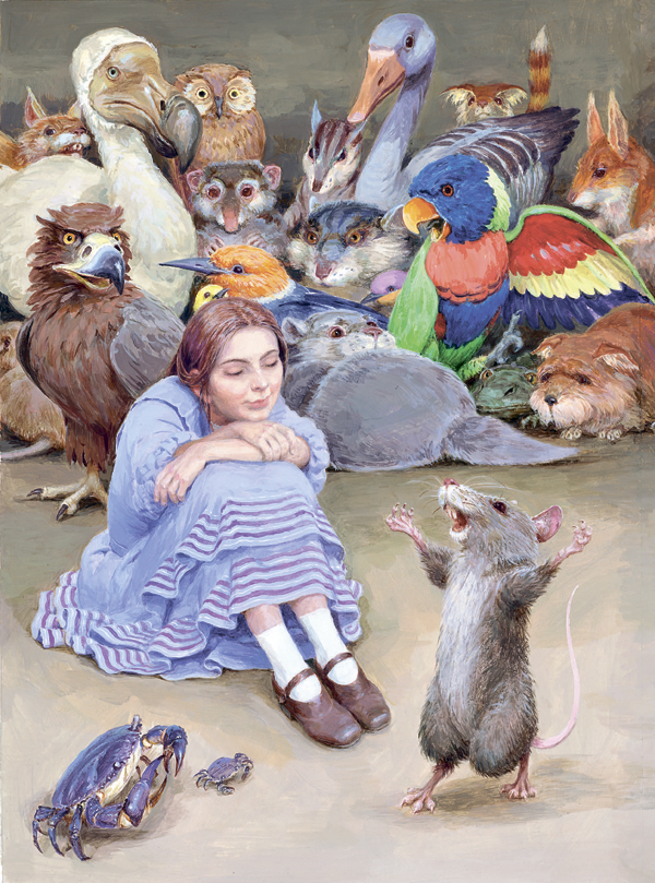 Все послушно уселись в круг, а Мышь стала посредине. Алиса не отрывала от нее глаз – она знала, что, если быстро не высохнет, ей грозит сильная простуда.