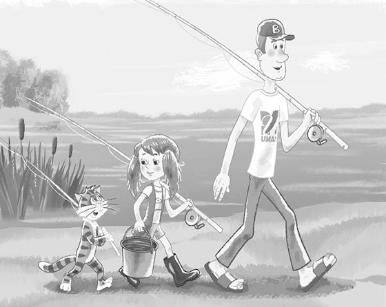 Уже почтальон Печкин ушёл. Уже все другие рыбаки ушли. И наконец Катя с папой стали собираться домой. Вытащили они сначала свои простые удочки, а потом папа стал третью вытаскивать, не работающую.