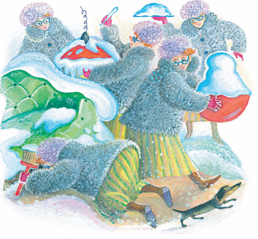Все тёти в серых шубках начали быстро выносить снег. Одна выгребала снег из-под дивана. Другая ловко сбивала сосульки с люстры. Сугробы стали быстро уменьшаться. Длинная собака свободно забегала по полу.