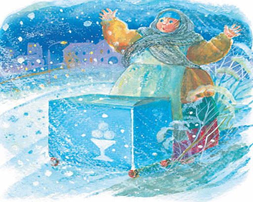 Вася подошёл к продавщице поближе. Но ветер-ветрище был уже тут как тут. Он теперь ни на шаг не отставал от Васи. Ветер-ветрище стал кружить вокруг Васи и продавщицы мороженого и посыпать их колючим снегом.