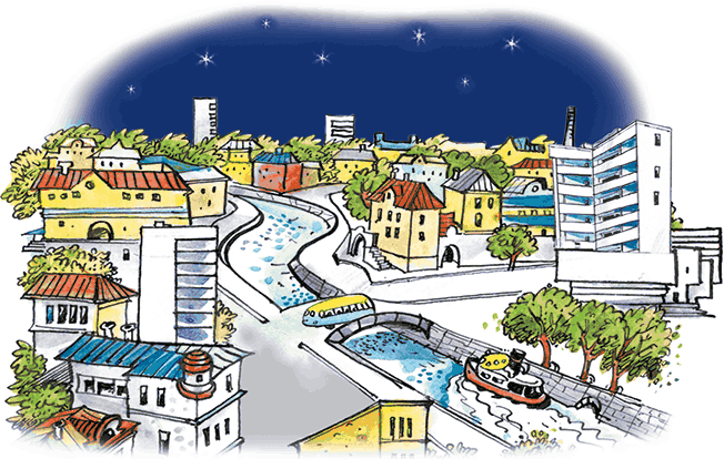 И вот уже стали зажигаться в окнах огоньки, и радио заиграло музыку, и в небе задвигались тёмные облака – они были похожи на бородатых стариков…