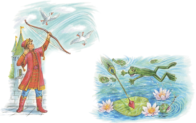 Взял Иван-царевич лук и стрелу и задумался. Куда стрелять? На какой двор ни пустишь стрелу, на чьё крыльцо ни попадёшь, отовсюду выплывет, как лебёдушка, этакая важная невеста со стрелой на подносе. Женишься, и мяч с ребятами не погоняешь, никакой живности в дом не притащишь. А он ещё мальчишка, начнёт жена им командовать: «Не вертись! Не чавкай! Посмотри, на кого ты похож! Кафтанов и камзолов на тебя не напасёшься! Сколько раз я тебе говорила!» И пустил стрелу не в поле (а вдруг там девицы снопы вяжут), не в лес (и там найдутся красавицы с корзинами для грибов или туесками для малины и брусники). Летит стрела в болото, где даже клюква не растёт, никого там не встретишь.
