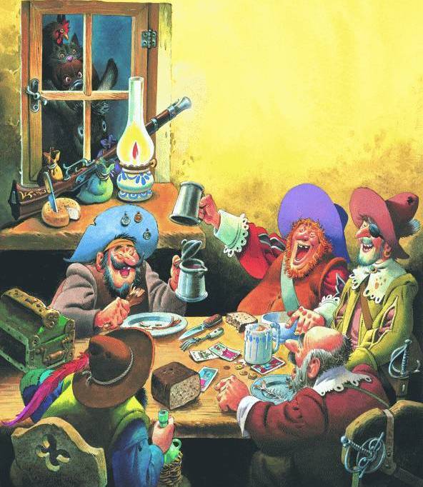 А в доме в это время пировали разбойники, награбившие много золота. Весь стол был завален яствами, от которых у наших голодных друзей потекли слюнки. Они придвинулись к окну ещё ближе, и осёл своей мордой нечаянно выдавил стекло. А его друзья посыпались сверху и разбили лампу на подоконнике. В ту же секунду тёмная комната огласилась рёвом осла, лаем собаки, шипением кота и кукареканием петуха.