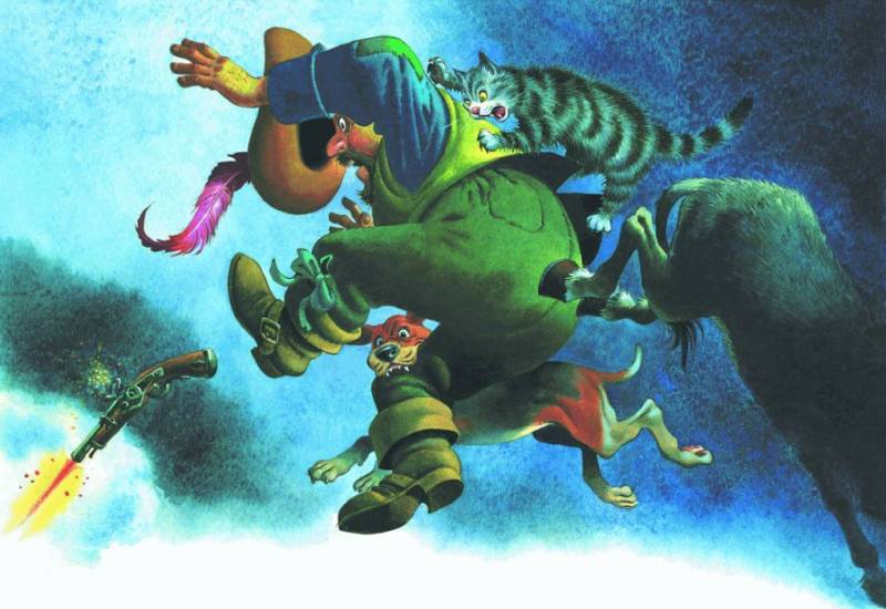 С пистолетом в дрожащей руке он направился к камину, рядом с которым лежал кот. Его горящие в темноте глаза разбойник принял за тлеющие угольки и поднёс к ним спичку. В то же мгновение кот вцепился ему в лицо, а собака прокусила ногу. Вскрикнув от боли, разбойник выронил пистолет. Пистолет выстрелил, и осёл так лягнул его в спину, что разбойник, выбив дверь головой, вылетел из дома. Вдогонку ему неслось зловещее «кукареку»!