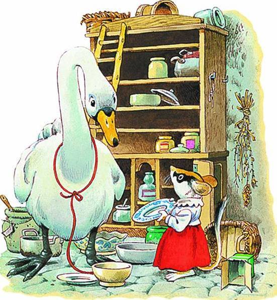 Как только растаял снег и земля подсохла, Чернышка стала выводить Белое Пёрышко на прогулки. Если они отправлялись за покупками, Чернышка привязывала к шее лебедя красный шнурочек, давала ему в клюв корзинку, и они важно шествовали через всю деревню. И вся деревня смотрела на них. «Вот какой помощник появился у нашей Чернышки», – думали жители. А некоторые спрашивали: