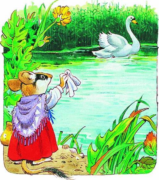 Мышка часто приходила проведывать лебедя, и он катал её по своему озеру.