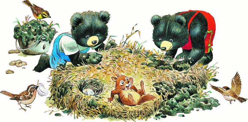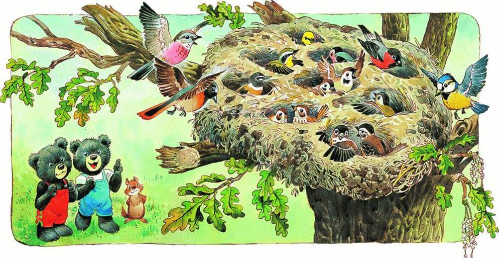 Гнездо сооружали на большой поляне. Тип принёс глину, Топ – солому, птицы тащили в клювах веточки, листики и пушинки. Медвежата лепили гнездо, а бурундук помогал уминать глину. К концу дня гнездо было готово. Только как поднять его на большой дуб? Одной птичке не под силу, двум тоже. Даже целая стая не смогла бы его поднять. Но когда слетелись все птицы со всего леса и с соседнего луга – гнездо подняли и осторожно положили среди ветвей.
