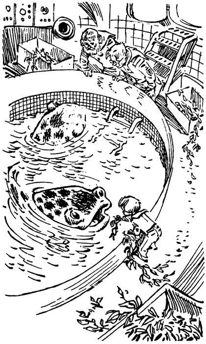 К вечеру длина головастов достигла трех с половиной метров. Им уже трудно было плавать в бассейне, и они покачивались у дна, всплывая, только чтобы схватить пучок водорослей.
