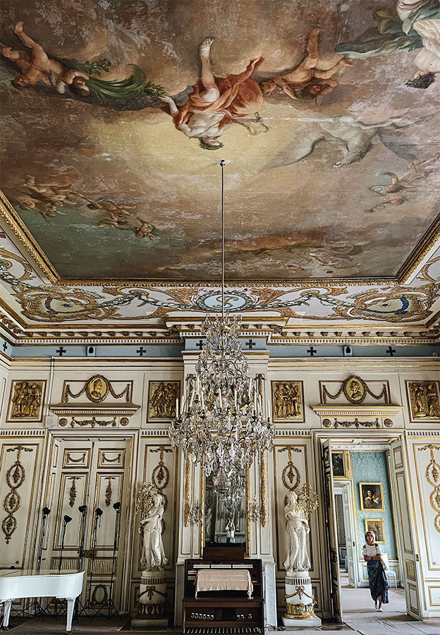 Парадные анфилады соединяются в большом танцевальном зале в центре дома. Белые стены покрывает золотая резьба – это тоже обманка из папье-маше и мастики. Вечером, когда зажигали свечи, в зале разыгрывалась мистерия: зеркала бесконечно множили сверкающие огни, а хрустальные подвески люстр преломляли свет. Настоящая магия! Не зря танцевальный зал сравнивали с зеркальной галереей Версаля. Из этой комнаты гости спускались во французский парк с мраморными скульптурами. Он заканчивался оранжереей, а каждая аллея вела к павильону с новыми развлечениями.