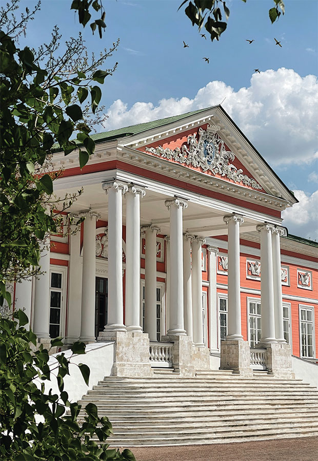 Граф не хотел отставать от моды и заказал дворец в духе раннего классицизма, который только появился. Но по традиции дом строили из дерева, поэтому получилось любопытное сочетание старого и нового. «Старое» мы видим и в барочных чертах фасада. Фронтон дома, то есть верхняя часть портика в форме треугольника, выглядит массивно и делает дворец непропорциональным. Его украшает обильная резьба, типичная для стиля барокко. В центре фронтона картуш, то есть щит, с вензелем хозяина «PS» – его венчает графская корона, а вокруг ползут стебли зелени и извиваются ленты. Но фасад дома меркнет перед его великолепными интерьерами, настоящими театральными декорациями. Разве могло быть по-другому у Петра Шереметева, любителя грандиозных праздников?