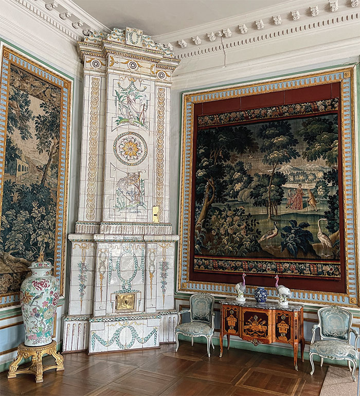 Двери вестибюля с двух сторон открывают парадные анфилады – одна комната перетекает в другую и отражается в зеркалах. Они висят в самом конце и создают еще одну иллюзию – бесконечной вереницы роскошных гостиных. В них стоят изразцовые печи и рядом мраморные камины – они больше для красоты, чем для тепла, с зеркалами в золотых рамах и с канделябрами. Мода на камины пришла из Западной Европы, но в русском климате они были неудобны. В одном из писем граф жаловался, что от каминов «везде дымно и холодно», отчего все кашляют.