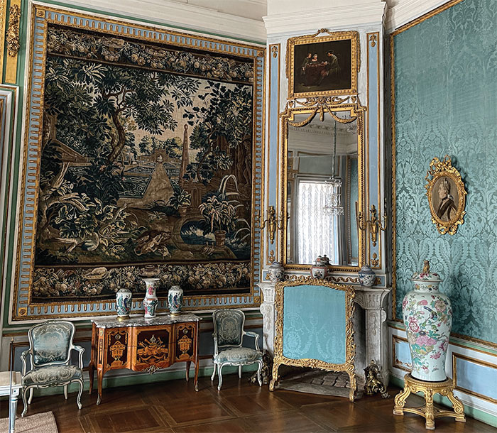 На стенах мы видим шпалеры – фламандские ковры-картины ручной работы. Они стоили баснословно дорого, ведь требовали не только особого умения, но и колоссального труда. Представьте себе, в палитре ковров около десяти тысяч оттенков! Мастера ткали их из толстой крашеной шерсти и изготавливали в день не больше тридцати квадратных сантиметров. На шпалерах изгибаются тенистые деревья, тянутся парковые аллеи на фоне моря и гор. Эти картины будто раздвигают стены и уносят вдаль – еще один сценический прием театрала Шереметева. Граф наполнил дом дорогущими диковинками: здесь и китайские фарфоровые вазы, и немецкий столик с бисерной столешницей, и настенные часы с боем из мастерской француза Шарля Буля. Из Англии для Шереметева привезли бильярдный стол из красного дерева – редкость по тем временам.
