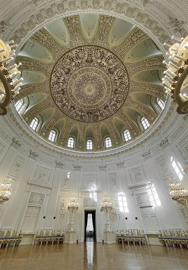 Однако граф не только следовал моде и придумывал, чем бы новым и необычным удивить гостей, он еще и использовал удачные находки из других своих дворцов. Его парадную спальню оформили так же, как и в Фонтанном доме в Петербурге, оттуда перевезли и барочный живописный плафон для столовой. Поэтому отголоски «старого» мы встречаем не только на фасаде, но и внутри. Сложно поверить, но граф-изобретатель сначала хотел отделать вестибюль кожами – с золотом, или с серебром, или с цветами. Но такая обивка устарела, и ее больше не продавали!