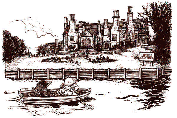 – Это Жаб-холл, – объявил Крыс, – а вон тот ручей – с табличкой «Частное владение. Высаживаться на берег запрещено» – ведёт к лодочному сараю, где мы и оставим нашу лодку. Справа – конюшни. Прямо, куда ты смотришь, банкетный зал. Жаб очень богат, и его дом один из самых красивых в этих местах, хотя мы ему об этом никогда не говорим.