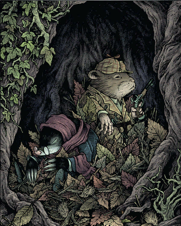 Крот устроился поудобнее в сухой листве, вытянул лапки и тотчас забылся тревожным сном, а Крыс набросал на себя листьев для тепла, улёгся и принялся терпеливо ждать, сжимая в лапах пистолеты.