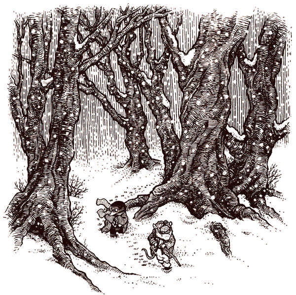 Крот, тоже выглянув наружу, увидел, что лес, казавшийся совсем недавно таким зловещим, совершенно преобразился. Норы, дупла, лужи, ямы и прочие тёмные препятствия, угрожавшие путнику, на глазах исчезали под блестящим снежным ковром, который было жаль пачкать грязными подошвами. В воздухе порхали красивые снежинки, легонько покалывая щёки, а тёмные стволы деревьев выглядели так, словно подсвечивались снизу.