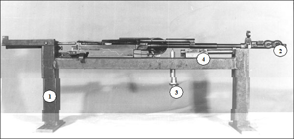 1 – основание; 2 – стреляющий агрегат; 3 – индуктивный датчик колебаний; 4 – индуктивный датчик перемещений.