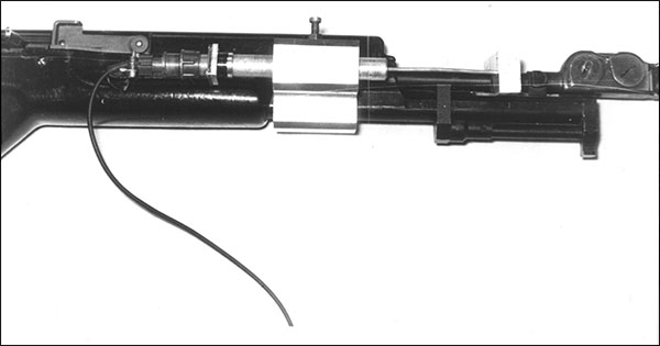 Для количественной оценки факторов, влияющих на кучность стрельбы из неустойчивых положений, был разработан экспериментальный образец, позволявший изменять силовые параметры противооткатных устройств или полностью устранять их воздействие. Проверка реакции стрелка на изменение положения центра массы системы в процессе отката проводилась на установке, имитирующей, с помощью упругих элементов, стабильное воздействие руки автоматчика на цевье.