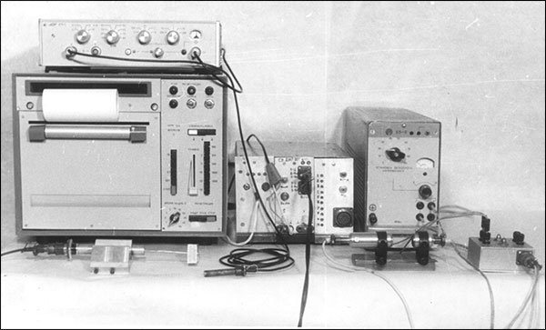 Для исследований факторов, определяющих рассеивание систем с лафетной схемой, был разработан комплекс лабораторного оборудования, включающий макет стреляющего агрегата, установленный в жестких опорах, измерительные приборы, позволяющие производить запись величин продольных перемещений и упругих колебаний ствольной группы, регистрировать момент вылета пуль, темп стрельбы и рассеивание точек попадания.