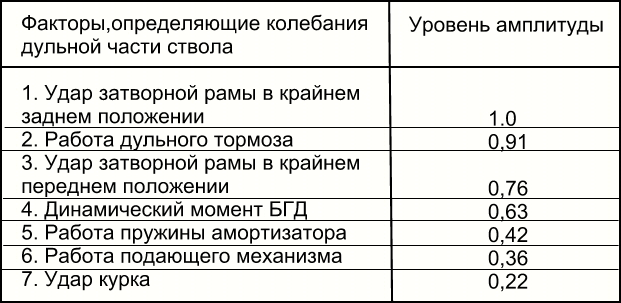 Степень выделенного воздействия различных факторов на колебания ствольной группы, характеризуемое максимальным значением амплитуды колебаний, по отношению к максимальному значению амплитуды колебаний, вызванных ударом затворной рамы, в крайнем заднем положении, принятую за единицу, приведена в таблице 1.