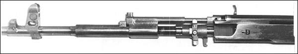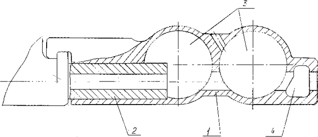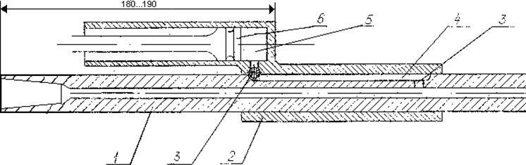 Предельное положение газоотводного отверстия устанавливалось по величине потерь скоростей затворной рамы при отпирании, критическому смятию закраины гильзы и отсутствию адгезии (взаимного проникновения и прочного соединения – аналогично сварочному шву – частиц металла) опорных поверхностей боевых упоров затвора и ствольной коробки. Проведенные эксперименты показали, что тугая экстракция гильзы в традиционной конструкции возникает в случае расположения газоотводного отверстия на расстоянии менее 200 мм от казенного среза ствола. В этих условиях сохранение обычной схемы газоотвода становилось невозможным и требовало отработки особого устройства газового двигателя. Схема разработанного, патентозащищенного, газового двигателя для автомата АН-94 с длинным газопроводом, изображена на рис. 17.