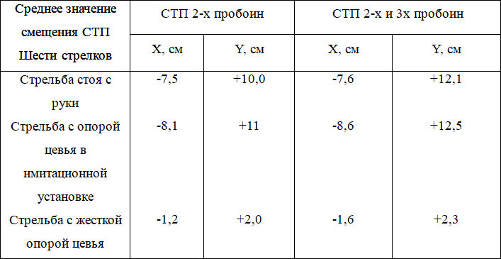 Экспериментально были установлены координаты средних точек попадания последующих выстрелов относительно прицельных. Результаты стрельб приведены в таблице 2.