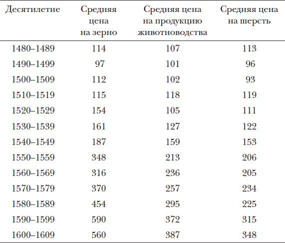 Изменение численности населения повысило спрос на сельскохозяйственные продукты, соответственно росли и цены. Этот процесс усугубили краткосрочные кризисы 1555–1559 и 1596–1598 годов (см. таблицу 2). В период после 1520–1529 годов выросли цены в целом и на зерновые в сравнении с ценами на шерсть.