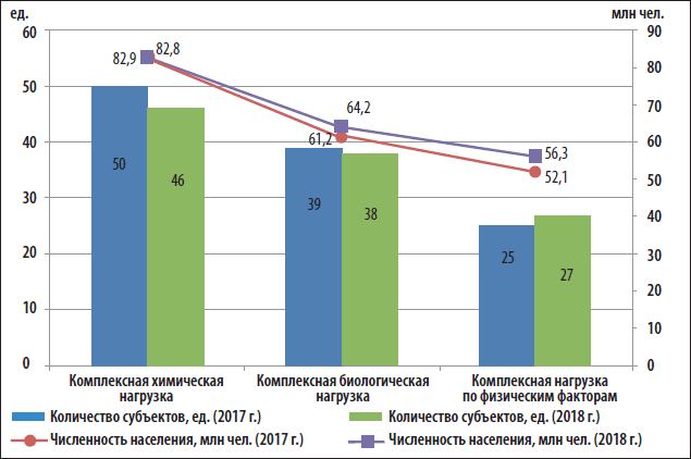 Рис. 5. Показатели комплексной нагрузки на население России по основным факторам ОС: по левой оси – количество субъектов РФ (ед.), по правой оси – численность населения (млн чел.) [109]