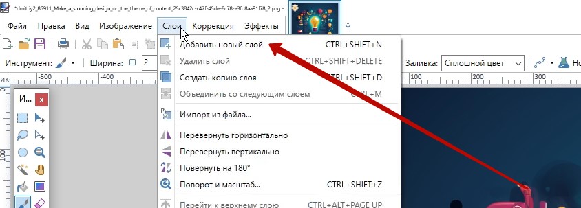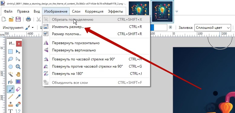 –– Откройте исходную картинку и измените размер. Вкладка Изображение – изменить размер: