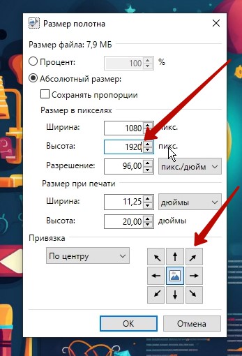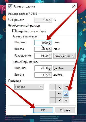 -– Задайте нужный размер (в нашем случае 1920) и с какой стороны будет увеличиваться полотно: