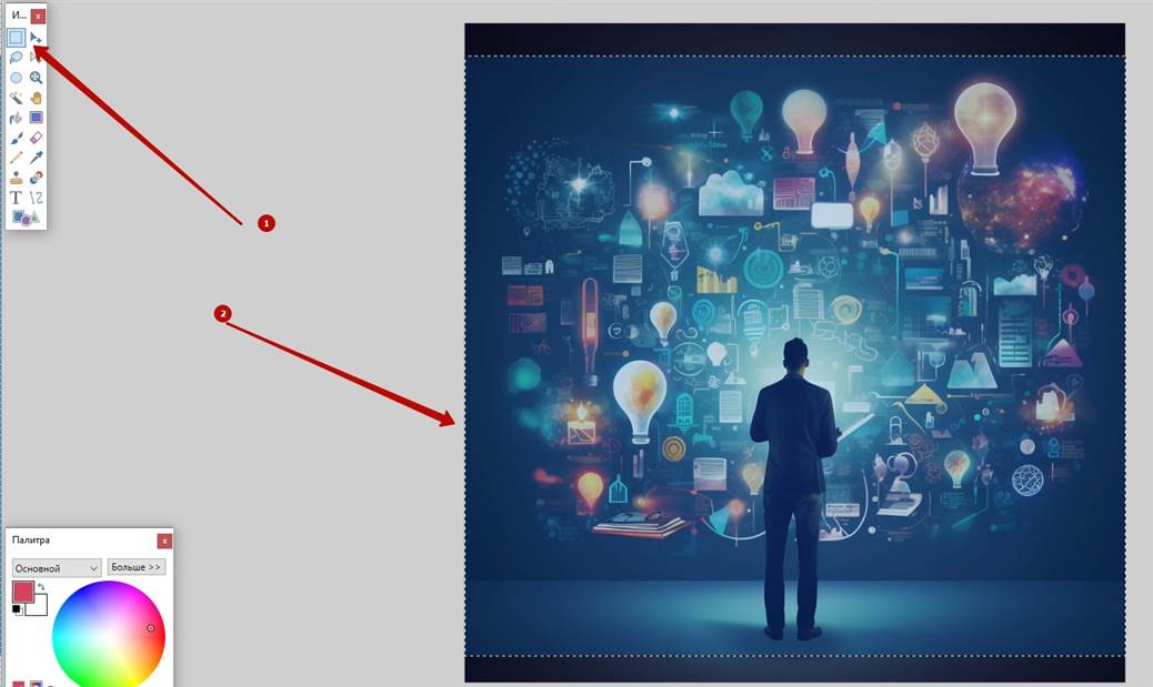 –– Выберите инструмент прямоугольная области и выделите на изображении только ту область, которую нужно оставить: