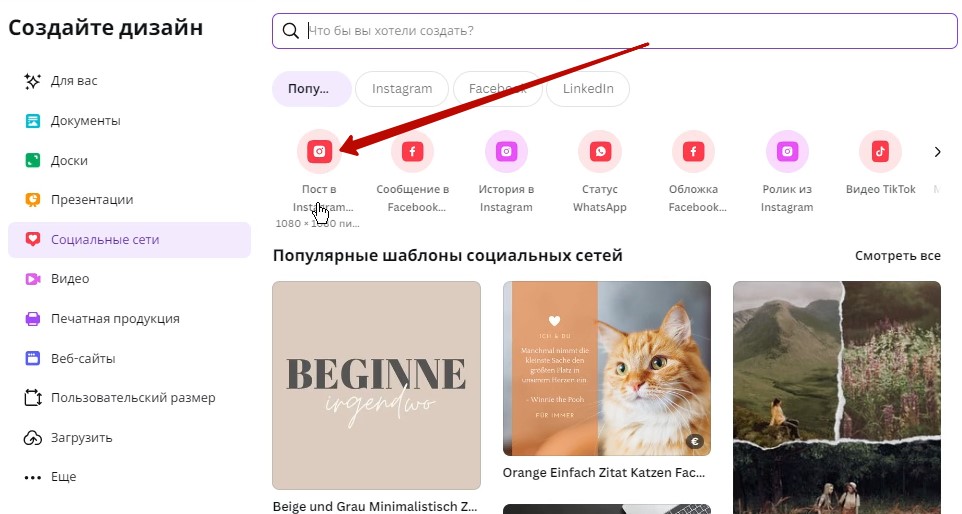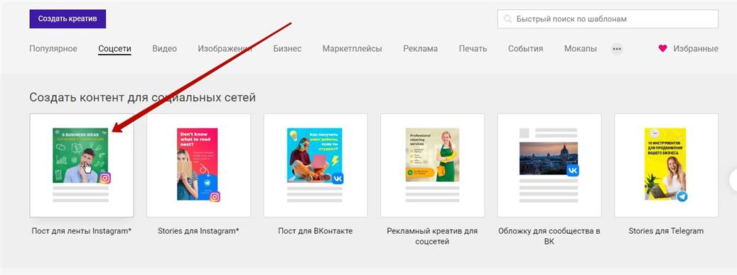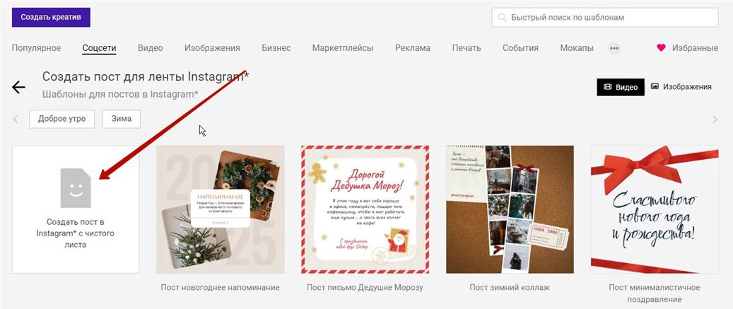 Мы создадим квадратную картинку, аналогичным образом вы можете сделать горизонтальную или вертикальную, изначально выбрав шаблон нужного соотношения сторон.