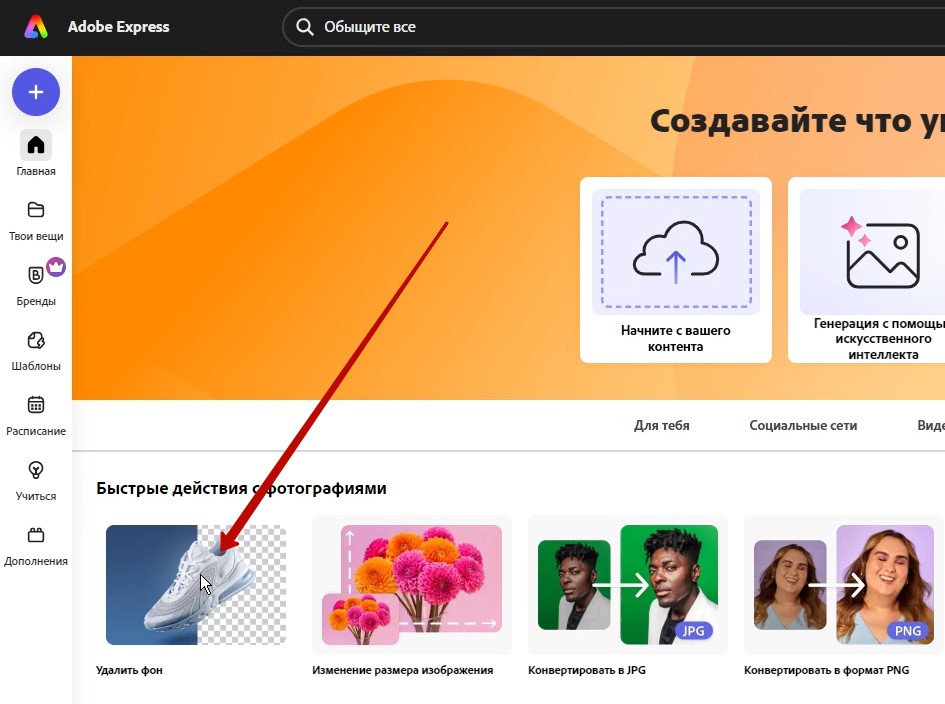 –– Перейдите по ссылке https://new.express.adobe.com/?category=photos, зарегистрируйтесь и выберите функцию Удаление фона: