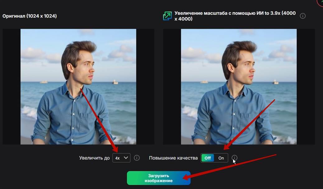 -– Система увеличит вашу картинку в 2 раза, при необходимости можно увеличить в большее количество раз и улучшить качество. Чтобы скачать, нажмите кнопку Загрузить изображение: