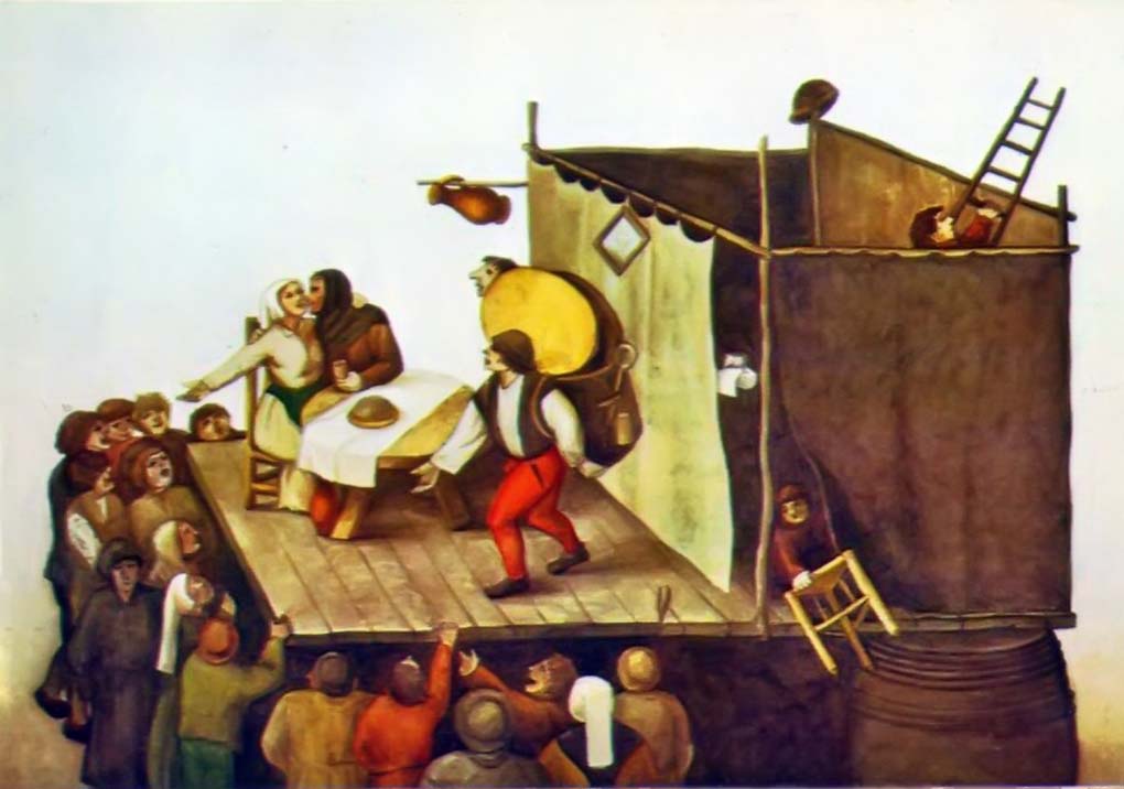 Средневековый уличный театр. Фрагмент картины Питера Балтенса, изображающей праздник в деревне.
