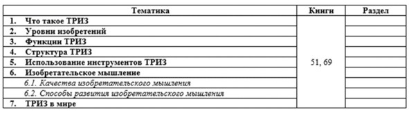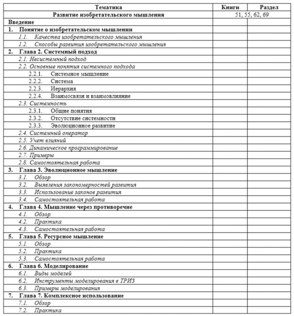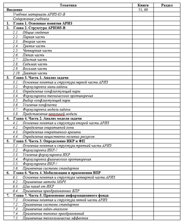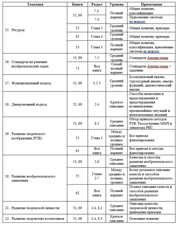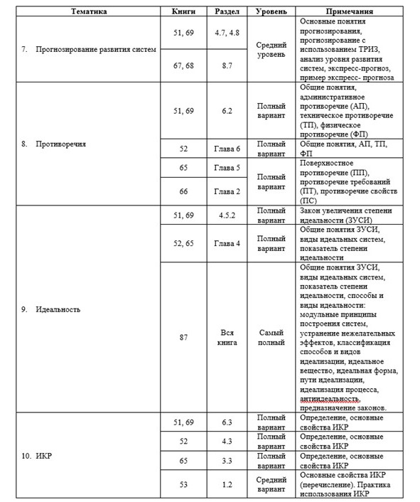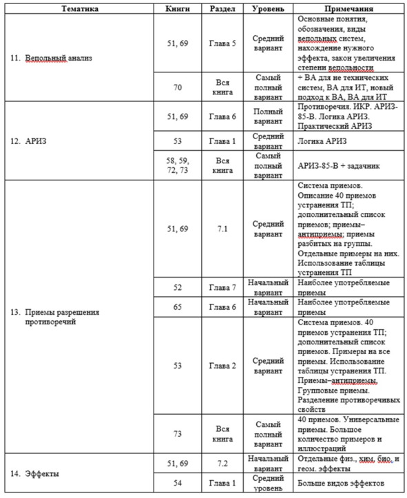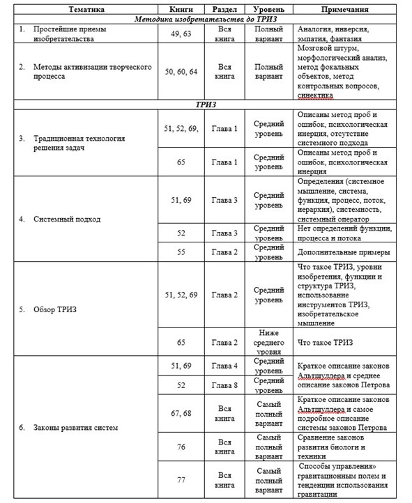 Этих материалов, по мнению автора, достаточно для эффективного подбора книг и составления учебных планов, подходящих как для людей, решивших самостоятельно освоить ТРИЗ, так и для преподавателей, чтобы составить собственные учебные программы и планы, или воспользоваться предложенными автором.