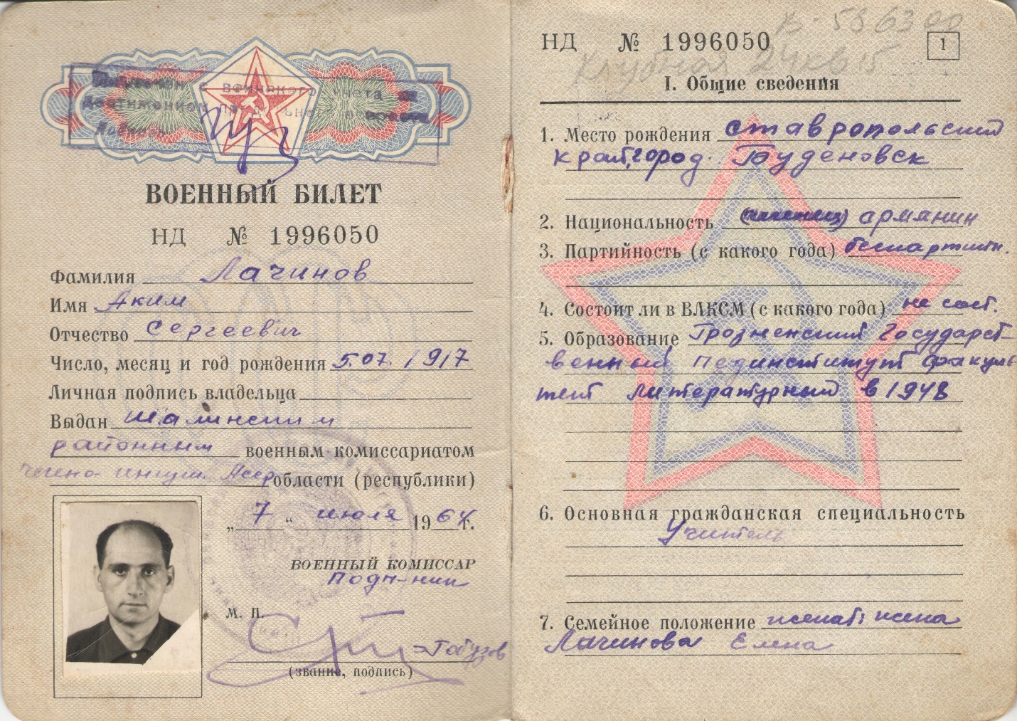 Военный билет А.С. Лачинова.