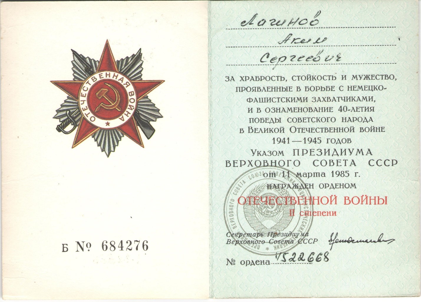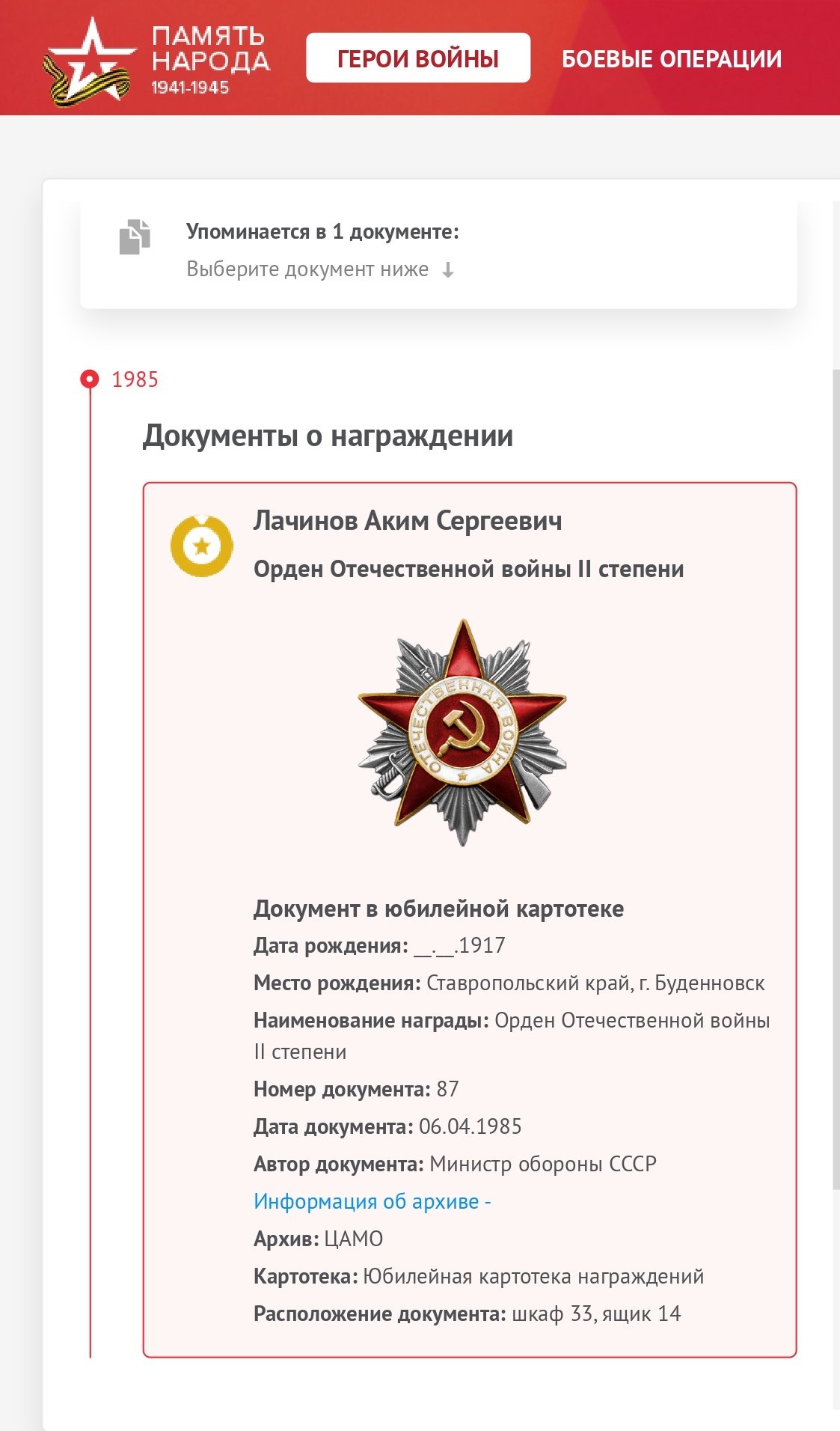 Орденская книжка А.С. Лачинова.