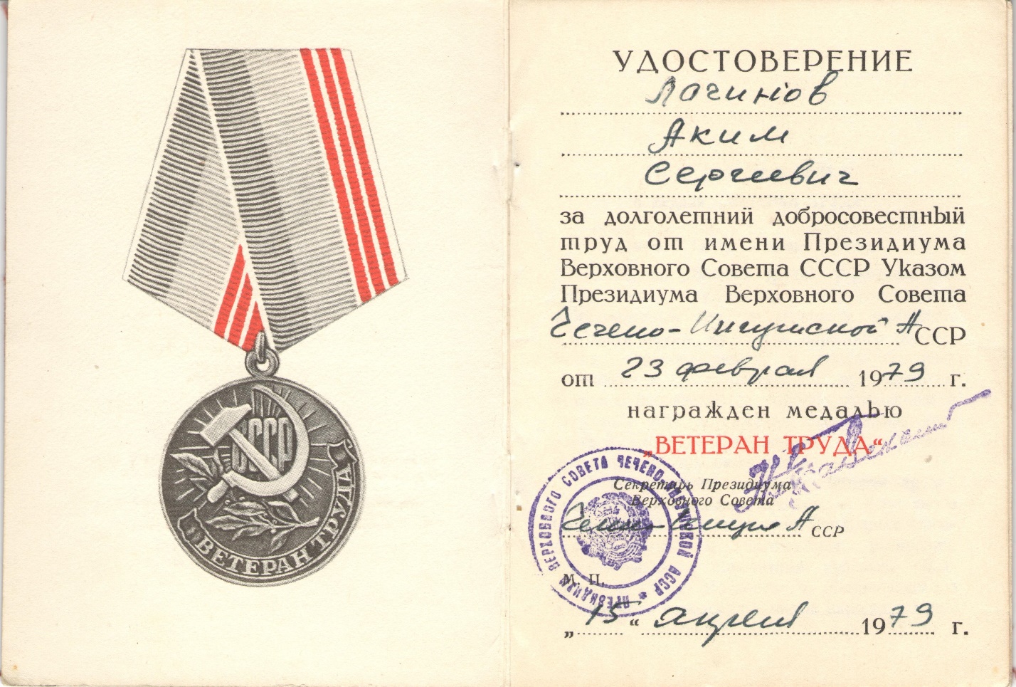 Удостоверение «Ветерана труда» А.С. Лачинова.