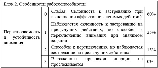 – Особенности работоспособности: переключаемость и устойчивость внимания;