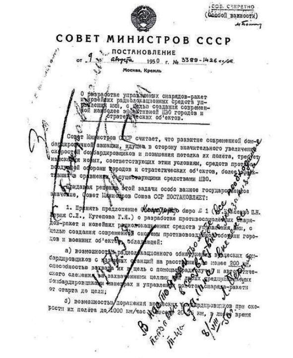 Первая страница постановления о создании ЗРС Беркут с визами И. В. Сталина и Л. П. Берии