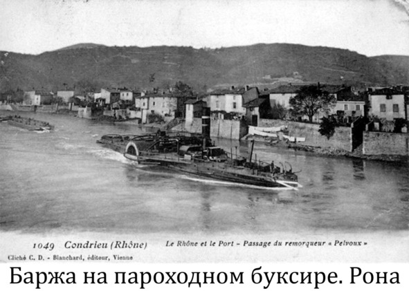 После опорожнения в пункте назначения их приходилось тащить обратно вверх по Роне с помощью больших команд лошадей. Около 1830 года появились паровые буксиры (реморкеры) с мощными двигателями, приводящими в движение большие гребные колеса. Они могли перевозить конвои пустых барж обратно вверх по реке, а также использоваться для доставки грузов вверх по течению.