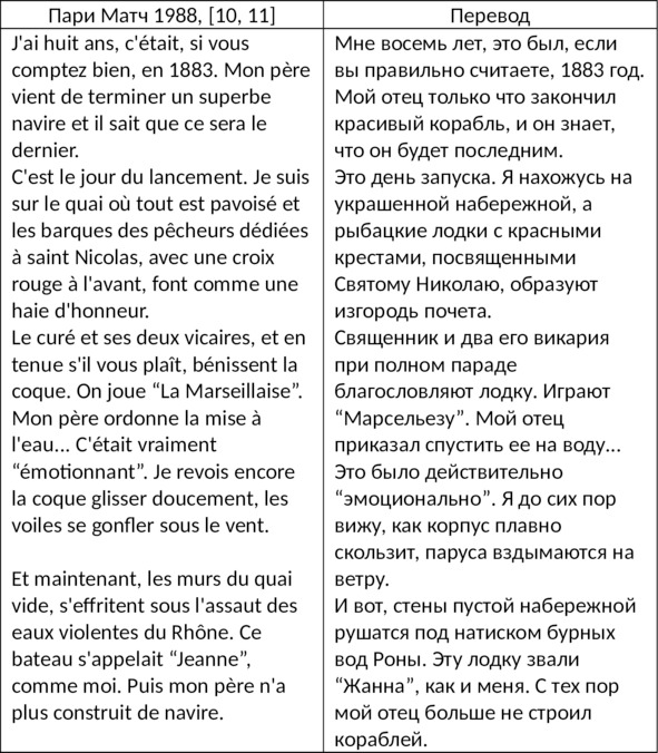 Однако, история запуска была уже рассказана несколькими годами ранее в интервью Пари Матч 1988 года. Эта версия включала в себя название «Жанна» и описывает, как ветер надувал ее паруса [10, 11].