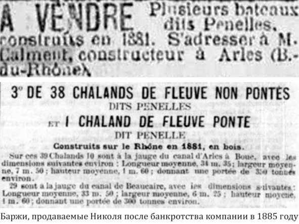 Морские баржи, проданные Николя в 1885 году, предназначались для перевозки 200 тонн угля на мелководье и были рассчитаны на то, чтобы поместиться в канале. Они также могли ходить по морю из Бука в Марсель. Если мадам Кальман знала, что эти корабли назывались «морскими», она могла предположить, что они не годились для реки.